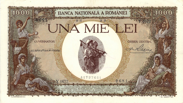 The first two volumes of Olivia Manning’s Balkan Trilogy are set in Romania in 1939 and 1940, and feature the plots and schemes of the small British expat community in Bucharest as they compete for status and argue the prospects for themselves and the country as war moves toward them. Some are without money, in particular Yakimov, prince of moochers, who is constantly looking to borrow ‘a thou’ — a thousand lei note — on the fiction that he’ll pay it back just as soon as his remittence comes in. The last gesture of David the spy, just before they do clear out, is to overtip a waiter with a 1000-lei note. All of which is to say that this banknote is the ideal bookmark for this set of novels.