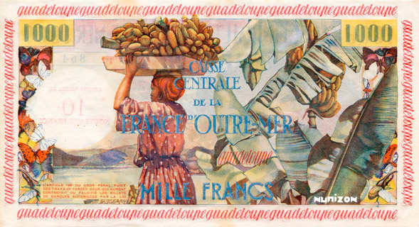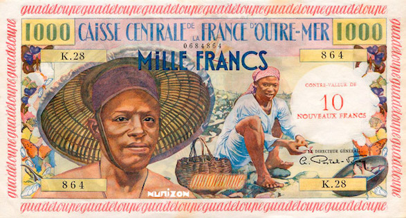 One thousand francs, or ten new francs, issued in 1960 in the French Caribbean. The man is wearing a salakot, a bamboo hat covered in madras cloth, worn by fishermen in Les Saintes near Guadeloupe, but invented in the Philippines and adopted by French troops in Indochina, who then introduced it to the Caribbean. Source.