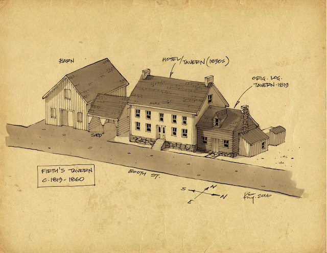 Firth’s Tavern 2026-04-29 ~ lojmit Ottawa’s first tavern stood on Booth Street where the War Museum now looms. Source. Related
