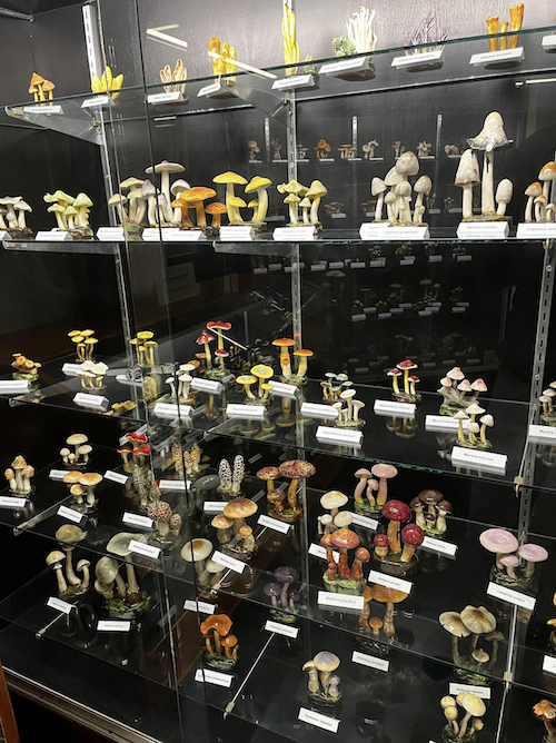 Ernst and Alma Lorenzen of Lantz, Nova Scotia specialized in ceramic replicas of local mushrooms. This collection of Lorenzen fungi is in the McCulloch Museum at Dalhousie University. Source.